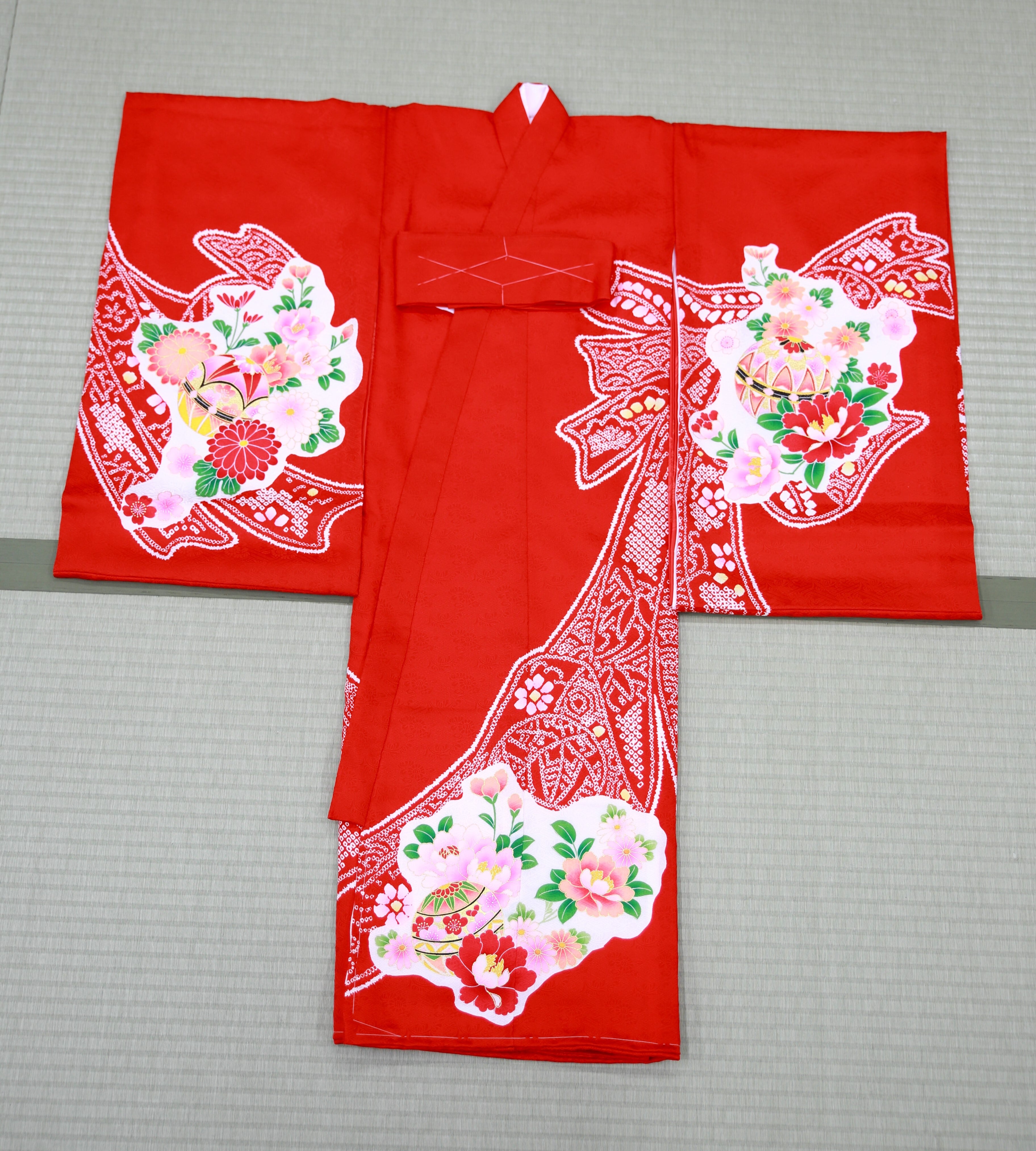 産土神(うぶすながみ)にお子様の誕生を報告し健やかな成長を祈る初宮詣り。真っ赤な地に白の中に毬や芍薬があしらって有りとっても可愛いですね。やはり人気の色は赤ですね!